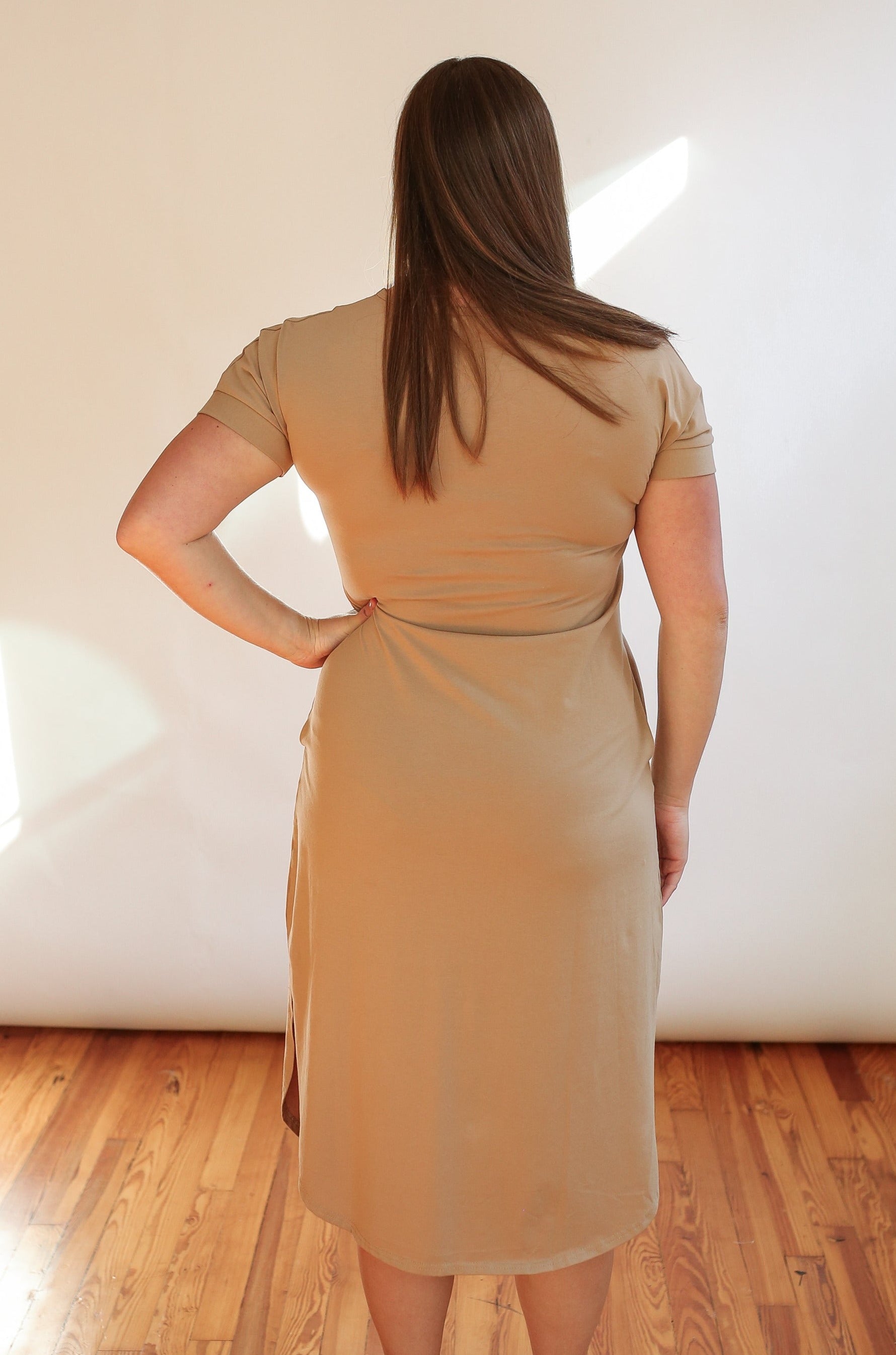 With a length that falls below the knee a slit hem detail to allow for easier leg movement, and POCKETS we feel like we've thought of it all with this one. The Midi Dress is available in green, khaki and black.