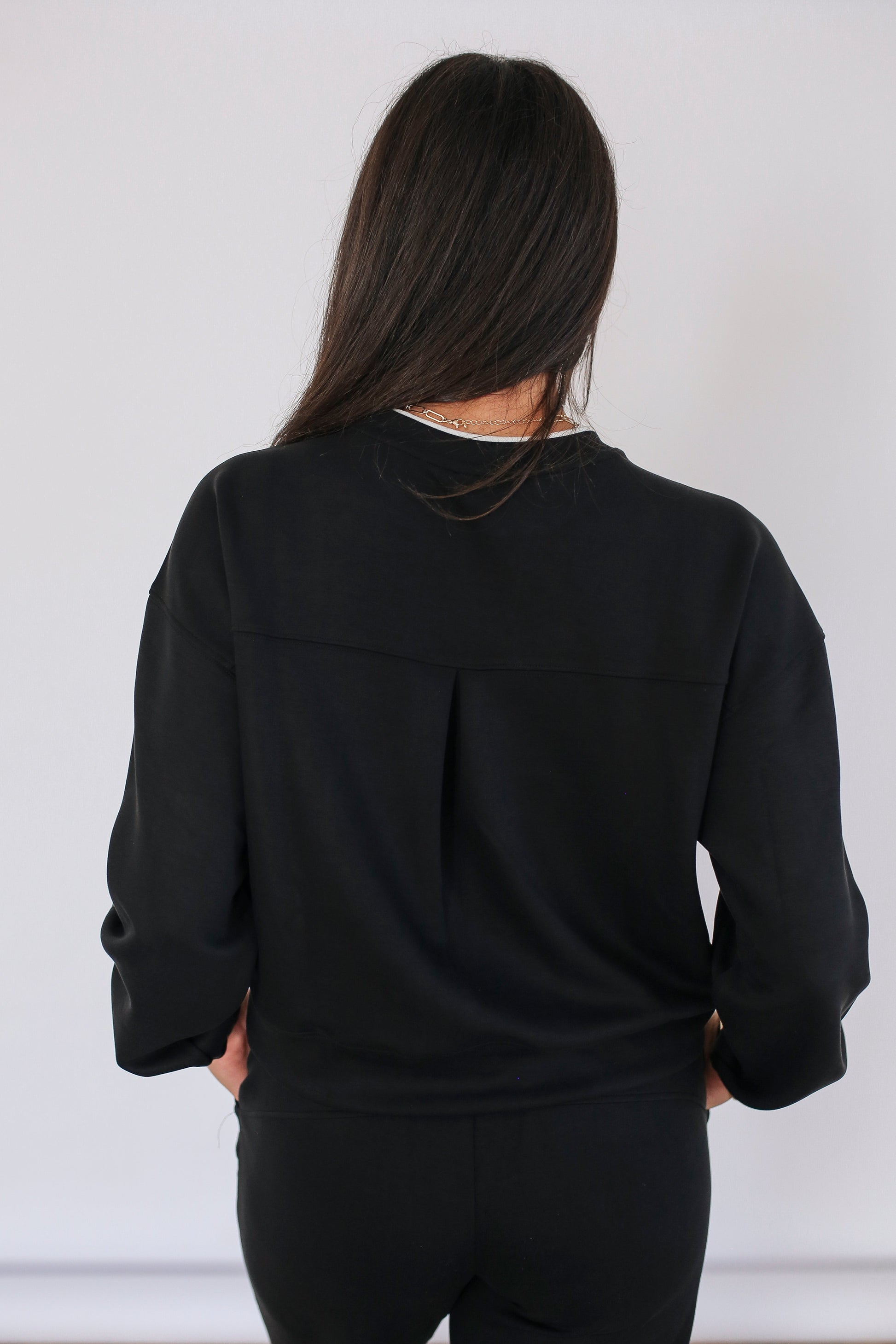 Hidden vertical invisible zippers on each side offer quick, discreet access for nursing or pumping, blending into the design so smoothly that no one would ever guess they're there. The back features a subtle pin-tuck detail, adding shape and visual interest while maintaining the relaxed, cozy fit you’ll want to live in.